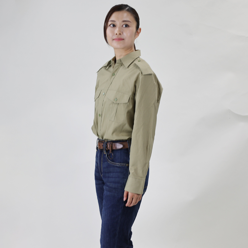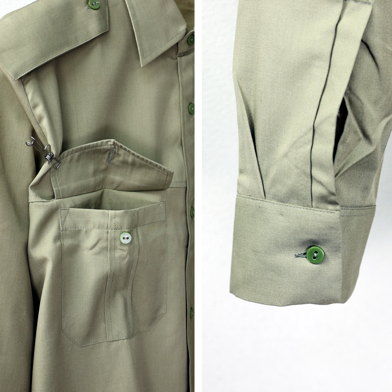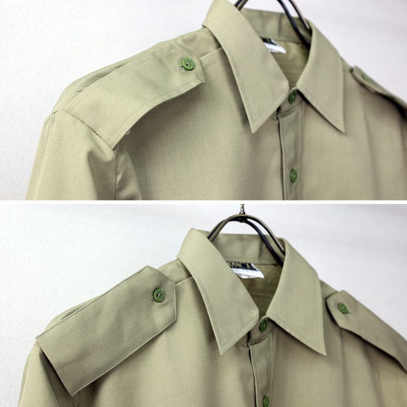 軍用シャツとして定番の胸ポケットと肩のエポレットあり。