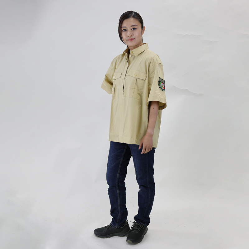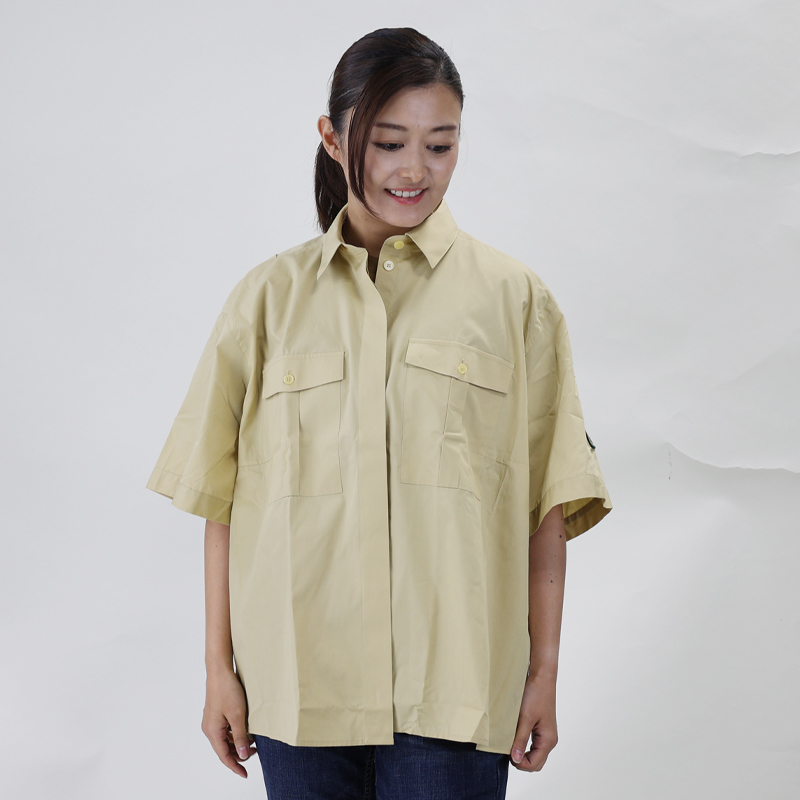 シャツは夏用の女性向けで、ボタンが比翼(隠しボタン)になり着丈も短めのスタイルとなっています。裾をインしてシャツ、アウトにしてアウター的な着こなしもOK。