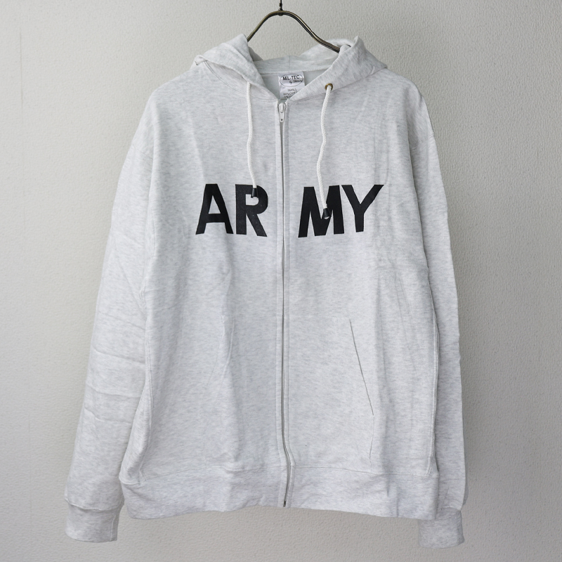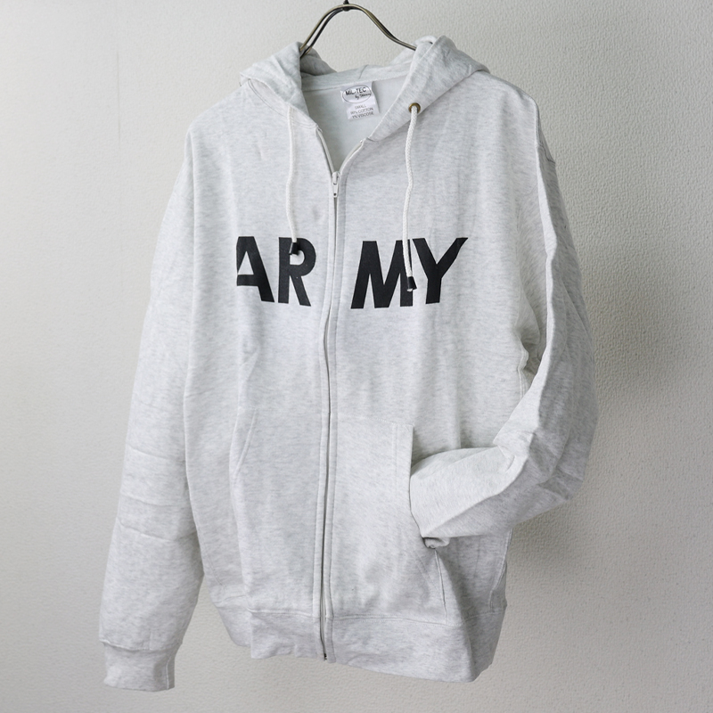 パーカーは袖口と裾にリブニット、ARMYとプリントされたシンプルなロゴ、ポケットは2つ。