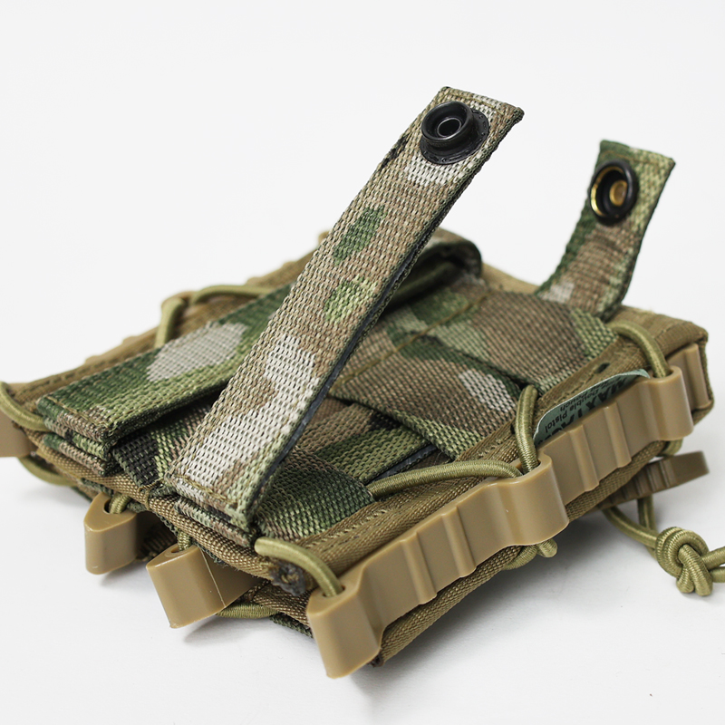 ピストルマガジンは面積が少ないため上から掛ける固定用のゴムはなく、下部にあるストッパーでマガジンのサイズに合わせてゴムを絞ることでマガジンの落下を防ぎます。