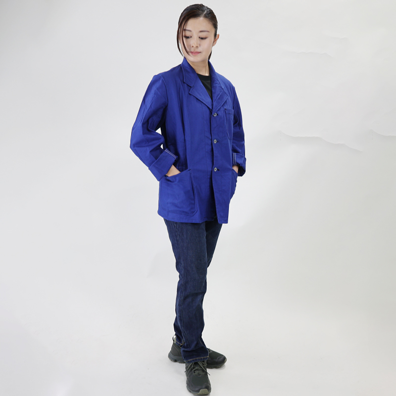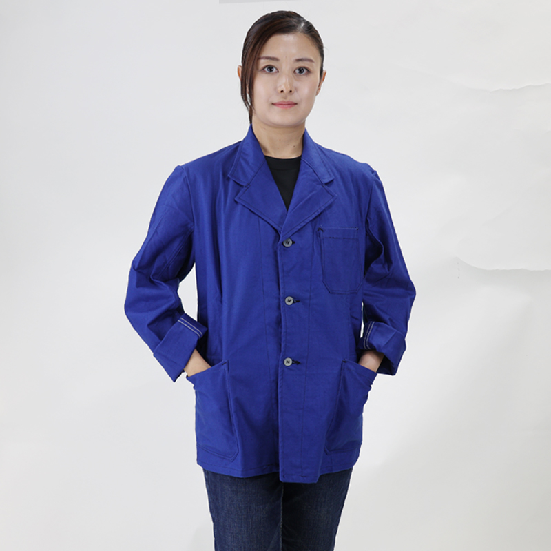 メインは作業服のため裏地もなく簡素なデザインですが、開襟でスーツのジャケットのようなスタイルを用いることでライトな制服としての役割も兼ねています。