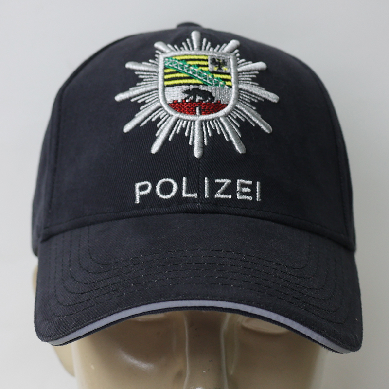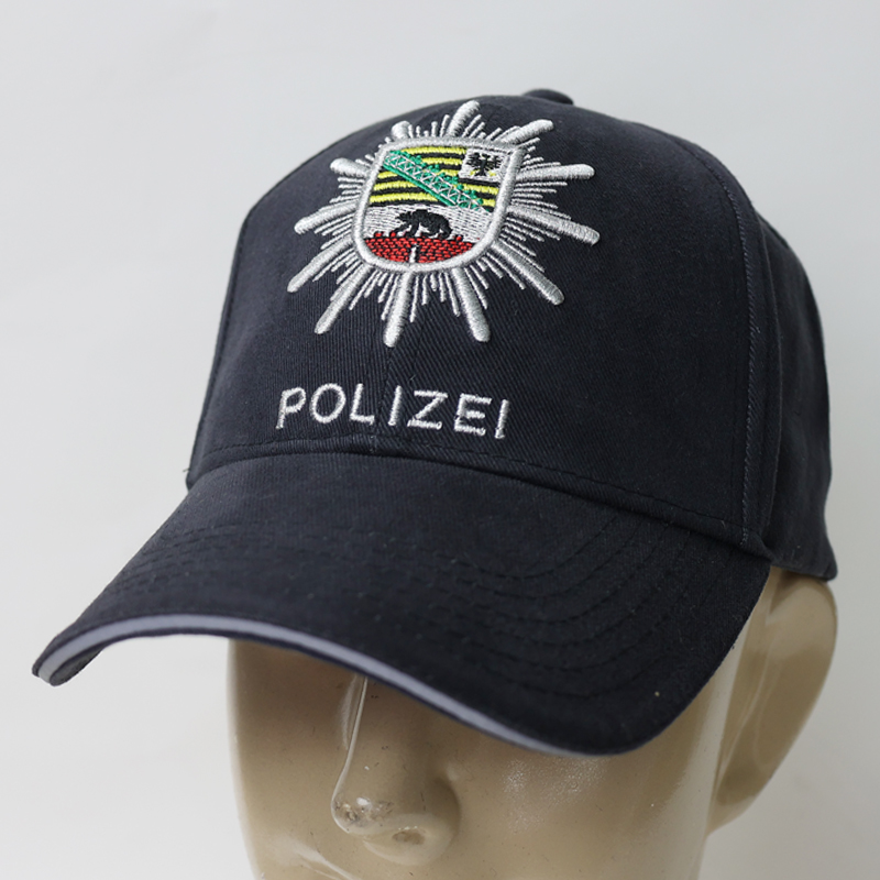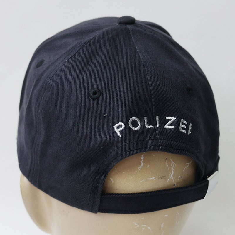 POLIZEIの刺繍が前後に。つばがリフレクティブ素材でふち取りされており、夜間でも目立ちます。