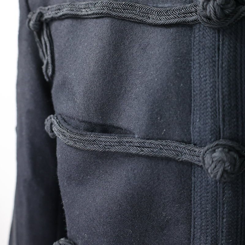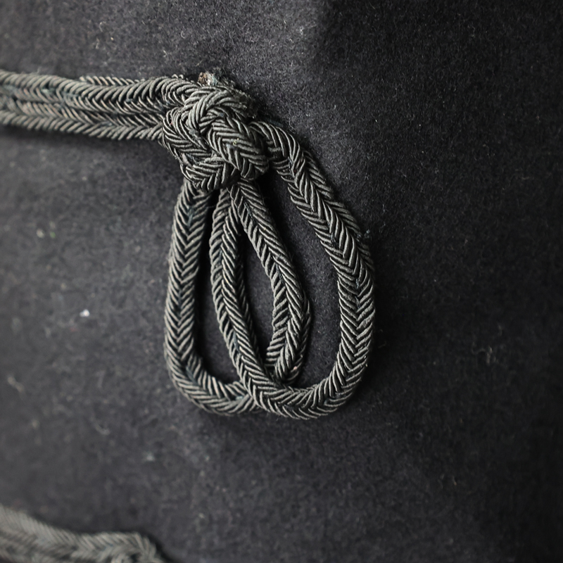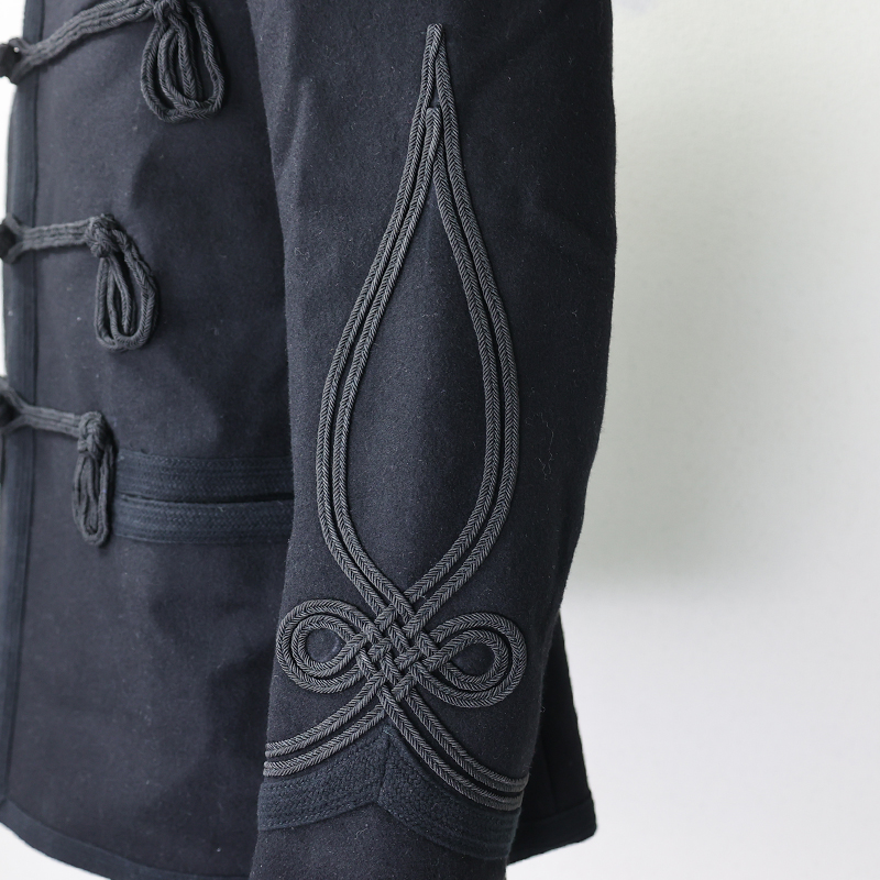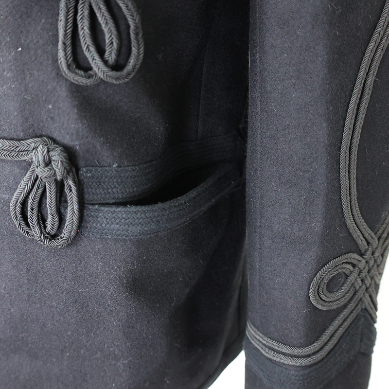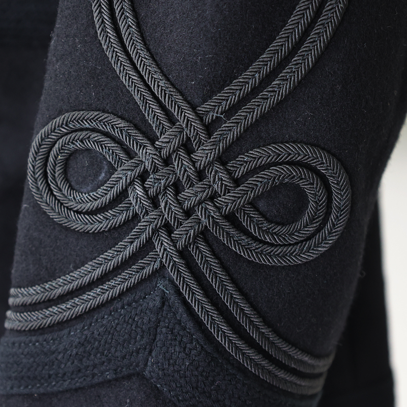 ラインの素材もこの服用に生産しました。袖のラインの編み込みが実物通りきちんと左右非対称となっており、正面から見た時のラインのデザインが整っています。この左右非対称は見た目よりも難しく、手間がかかり高度な職人技が必要となるため省略している複製品も多いのですが、この服はそれを克服し、非対称のラインが美しく縫い付けられています。