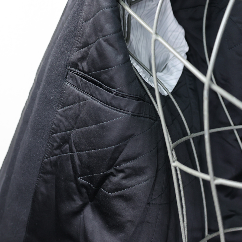 この服のために生地を生産しています。一般的に市場にある既成の生地は目が詰まっているとその分厚くて重くなりジャケットには不向きですが、この生地はこの服のためだけに織られたもので、目が詰まっていてもだだ厚くも重くもありません。このためジャケットとしての生地であり無駄に分厚くないため、袖のラインの縫製もきれいに仕上がります。