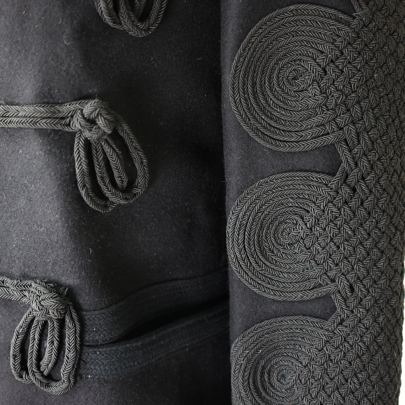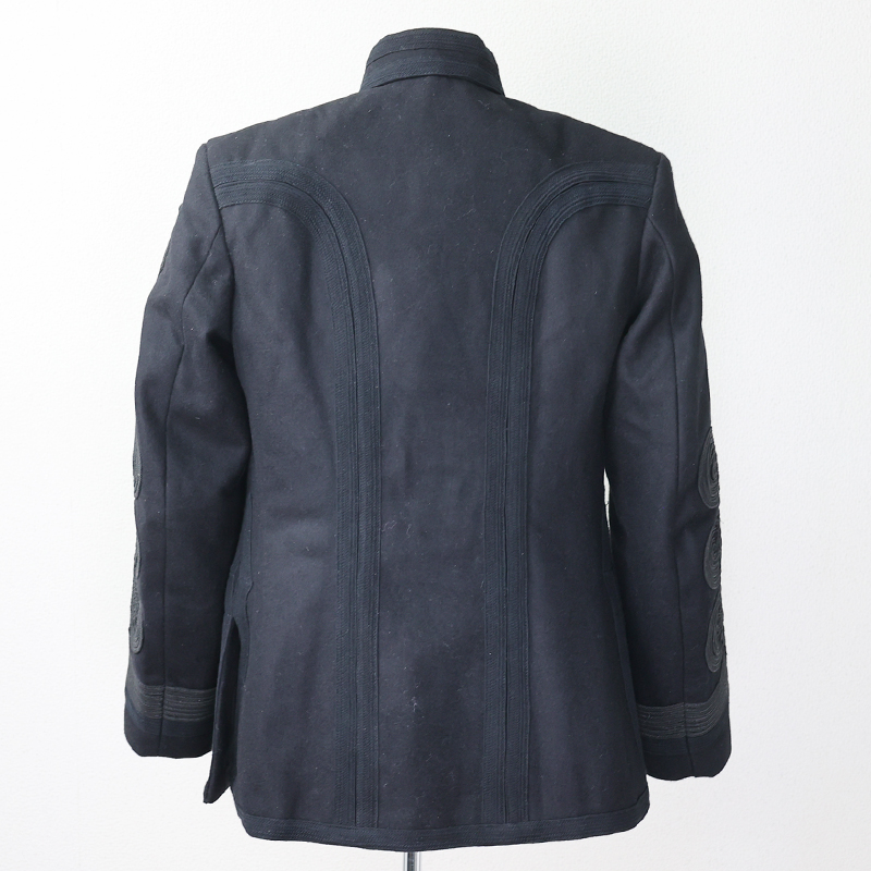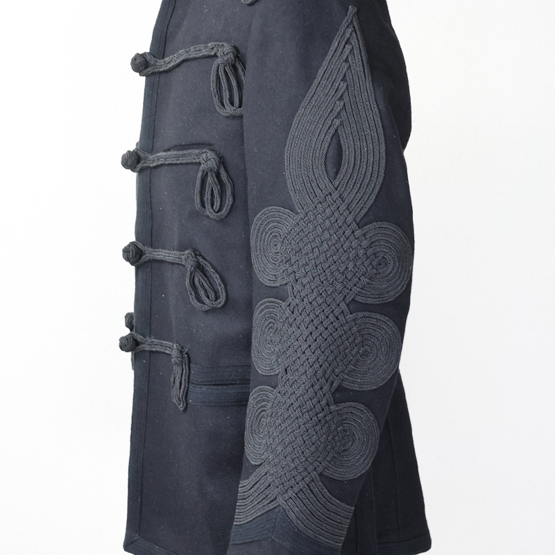 ラインの素材もこの服用に生産しました。袖のラインの編み込みが実物通りきちんと左右非対称となっており、正面から見た時のラインのデザインが整っています。美しく縫い付けられているのはもちろん、この左右非対称は見た目よりも難しく手間がかかるため、高度な職人技が必要となります。