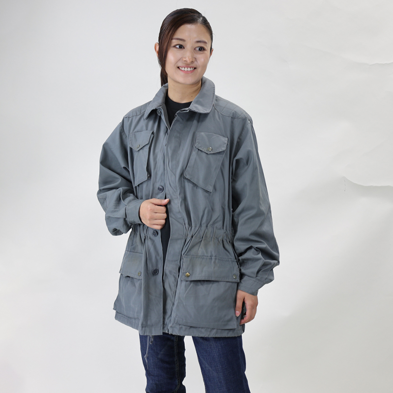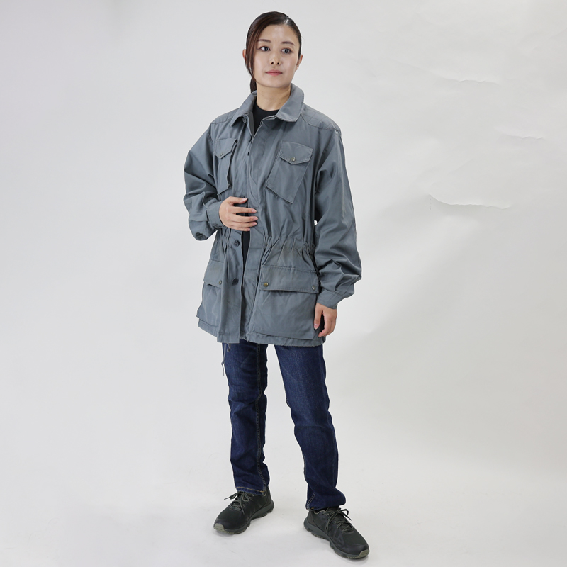類似した陸軍用のODは市場によく見られますがこちらは空軍向けのカラーで、肩とヒジにある網目状の防護パットが特徴的です。ウエストにはゴムが入っています。