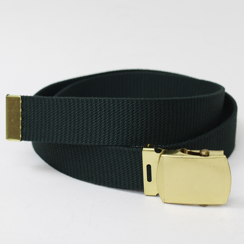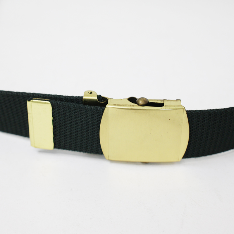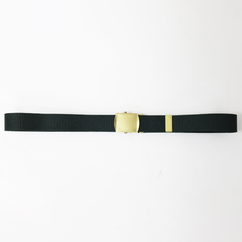 ローラーバックルでバックルと先端の金具は金色、ベルト本体は濃いグリーンです。
