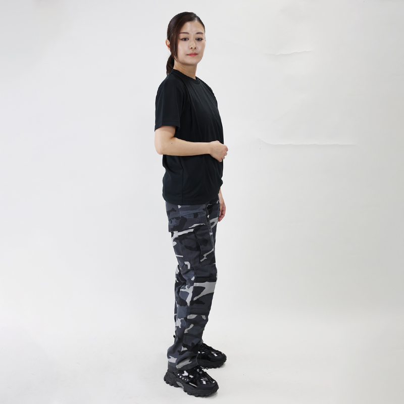 BDUパンツのデザインはウエスト、バック、レッグサイドのそれぞれ対象に計6つのポケットがあり、ひざとヒップには補強の当て布、裾を絞るコードを備えています。